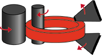 Ring diameters are increased as the continuous pressure reduces the wall thickness. The axial rolls control the height of the ring as it is being rolled. |